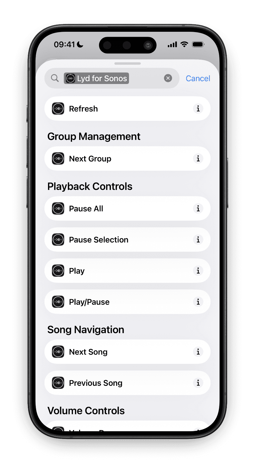 Lyd currently focuses on the most-used automation needs: starting and stopping playback. Future updates will add more Shortcut actions — volume control, grouping speakers, playlist selection, and beyond.
