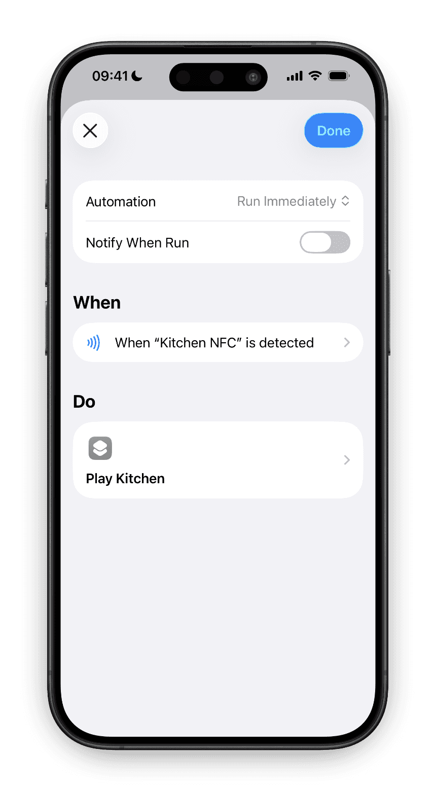 The problem: Too many taps to start your cooking playlist. The solution starts with buying a cheap NFC sticker and sticking it in your kitchen. Then create an automation that triggers when the NFC tag is scanned and tells Lyd to play your "Kitchen" group. From that point on, just tap your phone to the tag and music starts instantly.