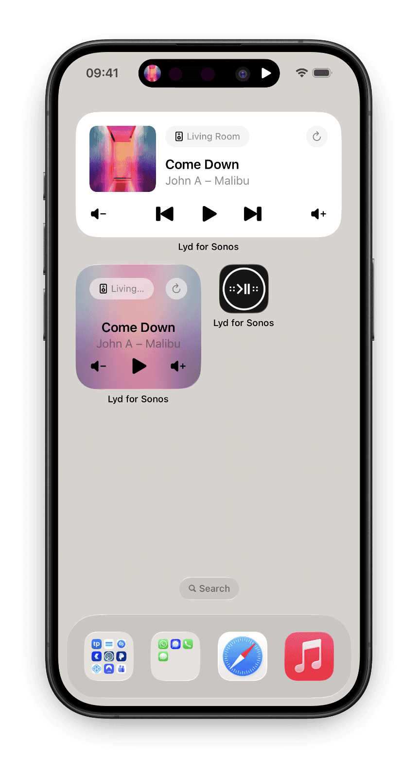 Lyd gives you instant Sonos control through Widgets and Live Activities across your entire iPhone interface.