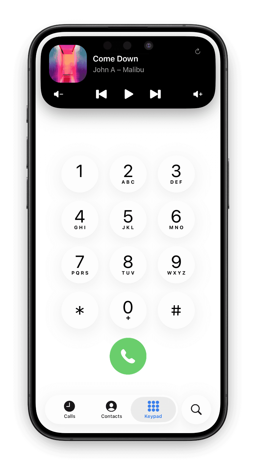 The Dynamic Island shows album artwork and playback info in its compact state. Tap and hold to expand it for full playback controls including play/pause, skip, and volume. The controls stay accessible no matter what app you're using.