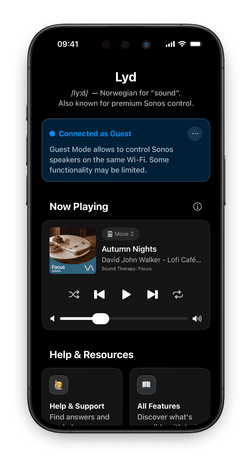 Tell your guests to open Lyd and enable Guest Mode. That's it. They get full playback control – play, pause, skip, volume, grouping – without accessing your account settings or seeing your credentials.